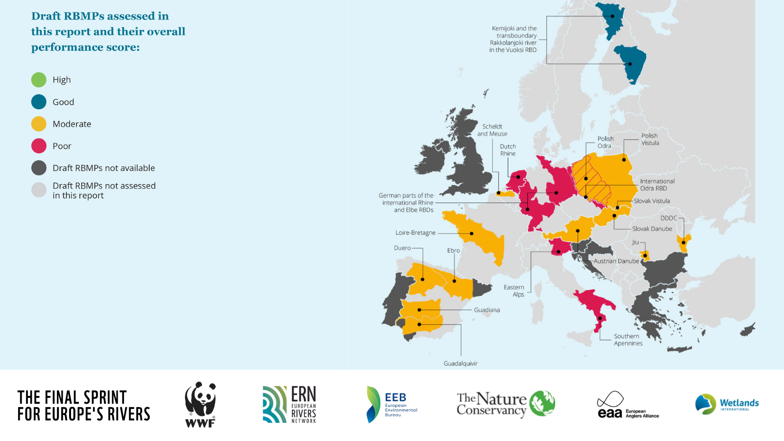 The second edition of this report, published by the Living Rivers Europe Coalition[1], finds that only two out of the 21 river basins analysed – both in Finland – might see good health by 2027. However, even the plans for those two basins contain gaps, in particular concerning the level of funding. For this edition, WWF assessed eight new draft plans from Poland, Romania and Spain, none of which are classed as “good”.