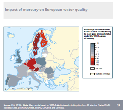 The most recent data, provided as part of the second river basin management plan reporting, indicate that nearly 46 000 surface water bodies in the EU (out of a total of approximately 111 000) exceed the mercury concentration set to protect fish-eating birds and mammals.